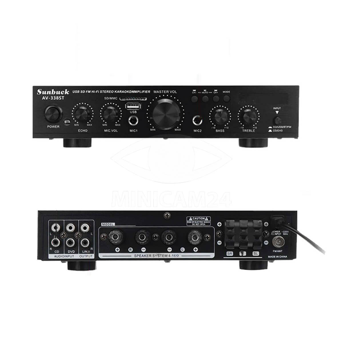 Sunbuck AV-338ST – пятиканальный 5.1 усилитель с поддержкой звука Surround, современным модулем Bluetooth 5.1 для беспроводного подключения смартфонов. Для проводного подключения используются несколько позолоченных RCA, два источника можно подключить одновременно. Пассивная акустика подключается к стандартным разъемам с пружинной клеммой, а для активного сабвуфера предусмотрен RCA выход. Помимо этого устройство поддерживает воспроизведение музыки в формате mp3 с флешки или карты SD объемом до 64Гб, а также включает тембр блок, встроенный приемник FM радио и функцию караоке с возможностью подключить два микрофона через входы 6.3мм и регулировать эффект echo и их громкость отдельно от общей. В комплект входит пульт для дистанционного управления режимами воспроизведения, встроенным плеером и радиоприемником.
